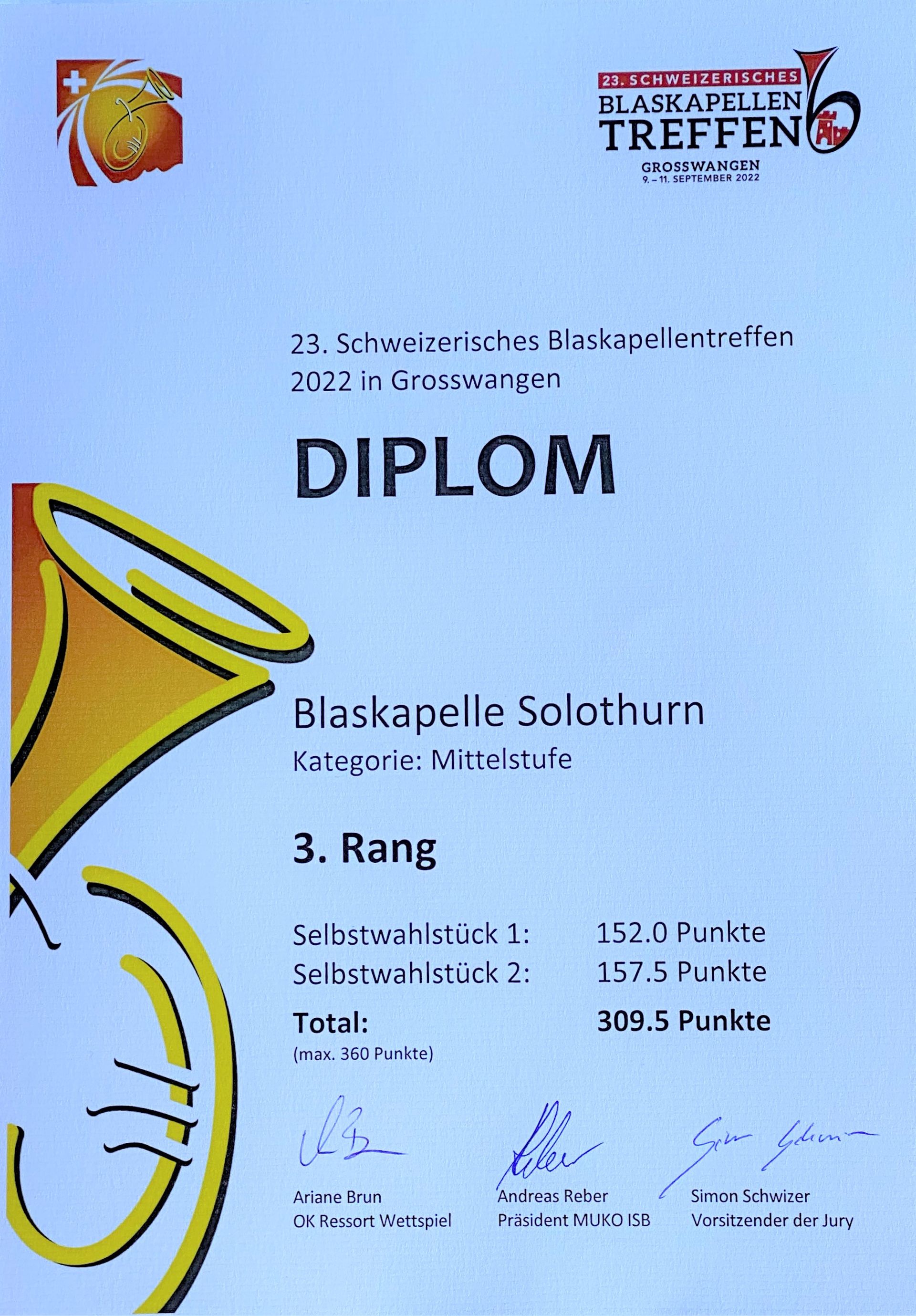Riesenerfolg der Blaskapelle Solothurn am 23. Schweizerischen Blaskapellentreffen im Luzernischen Grosswangen: