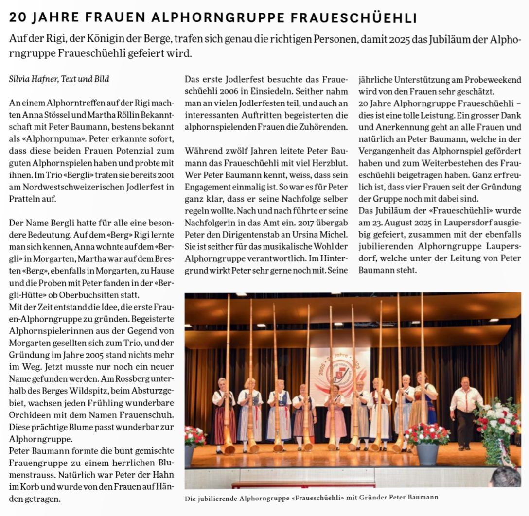 Die Alphorngruppe Fraueschüehli hat sich am Eidgenössischen in Zug mit dem Jubiläumschoral von Peter Baumann die Höchstklasse erspielt. Dasselbe ist auch dem gruppeninternen Trio «Sache git's» gelungen. Die Redaktion gratuliert den zentralschweizer Frauen von Herzen und wünscht ihnen weiterhin gutes Gelingen und viel Erfolg !!!