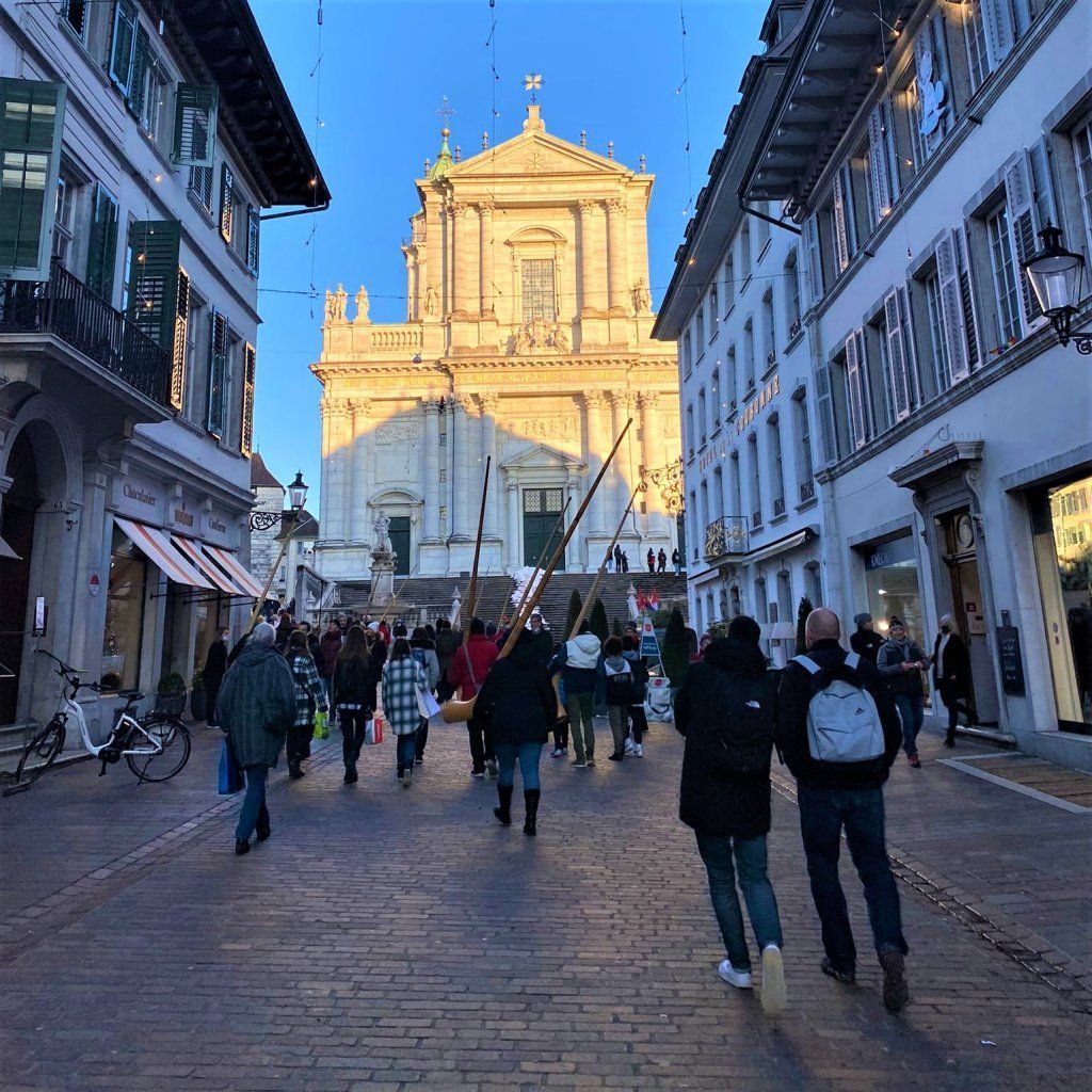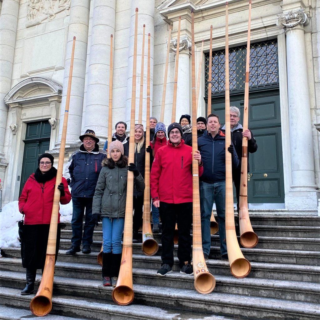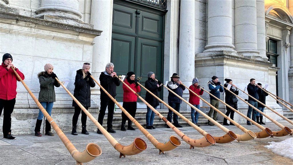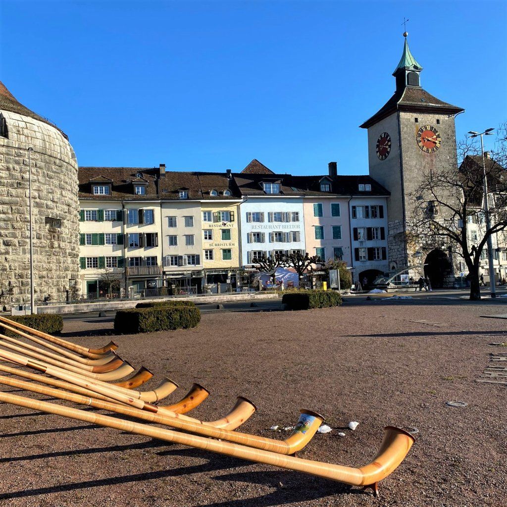 Anstelle des abgesagten Wiehnachtsmärets berieselte die Alphorngruppe Laupersdorf am 18. Dezember 2021 die Stadt Solothurn mit besinnlichen bis weihnächtlichen Klängen. Nach dem Amthausplatz war die Gruppe noch auf dem Friedhofplatz, dem Märetplatz und auf der St. Ursentreppe anzutreffen. Einmal mehr vermochten sie den vielen Zuhörerinnen und Zuhörern grosse Freude und vorweihnächtliche Stimmung zu bereiten.