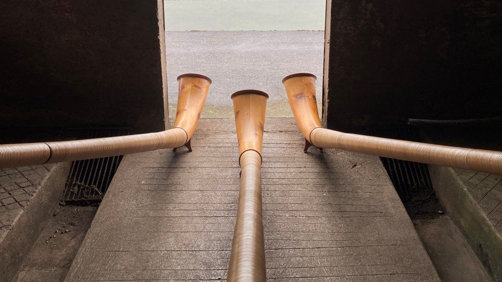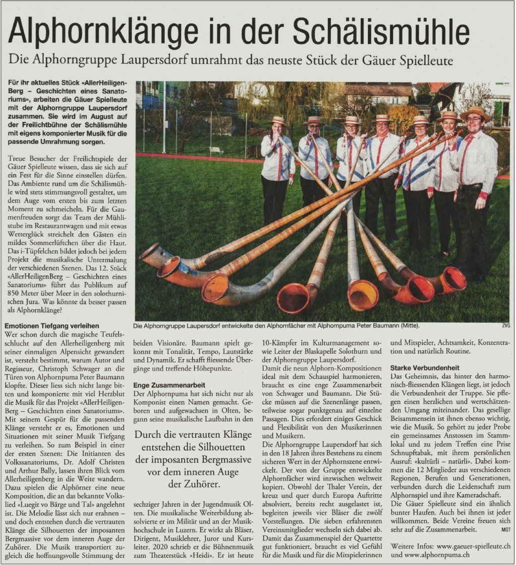 AllerHeiligenBerg hat Peter insgesamt neun Zwischen- bzw. Szenen-Sequenzen für Alphornquartett komponiert. Nun geht es an's einstudieren dieser Theatermusik. Die Laupersdörfer Alphornbläserinnen & -bläser haben sich damit eine sehr anspruchsvolle Herausforderung angelacht. Die Premiere findet am