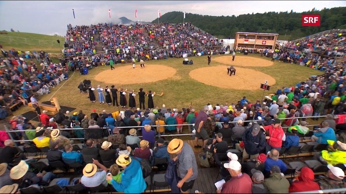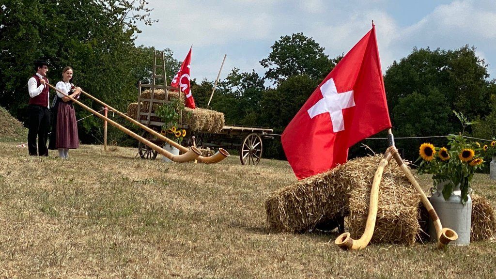 Stimmungsbild: Die Alphorngruppe Laupersdorf bei einem ihrer Freikonzerte am Zugersee, unterstützt von Berner Fahnenschwingern.